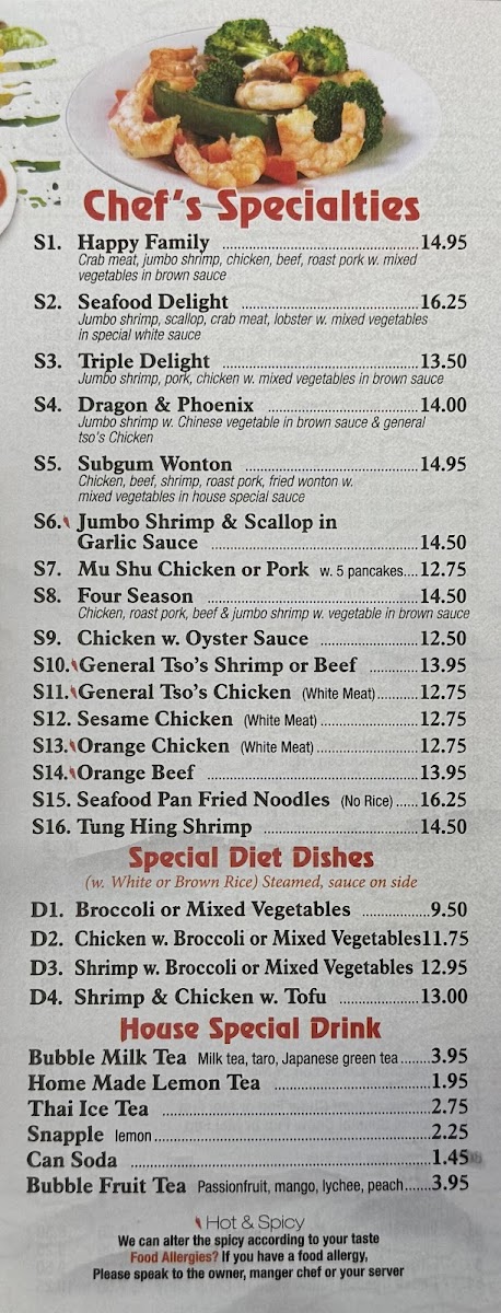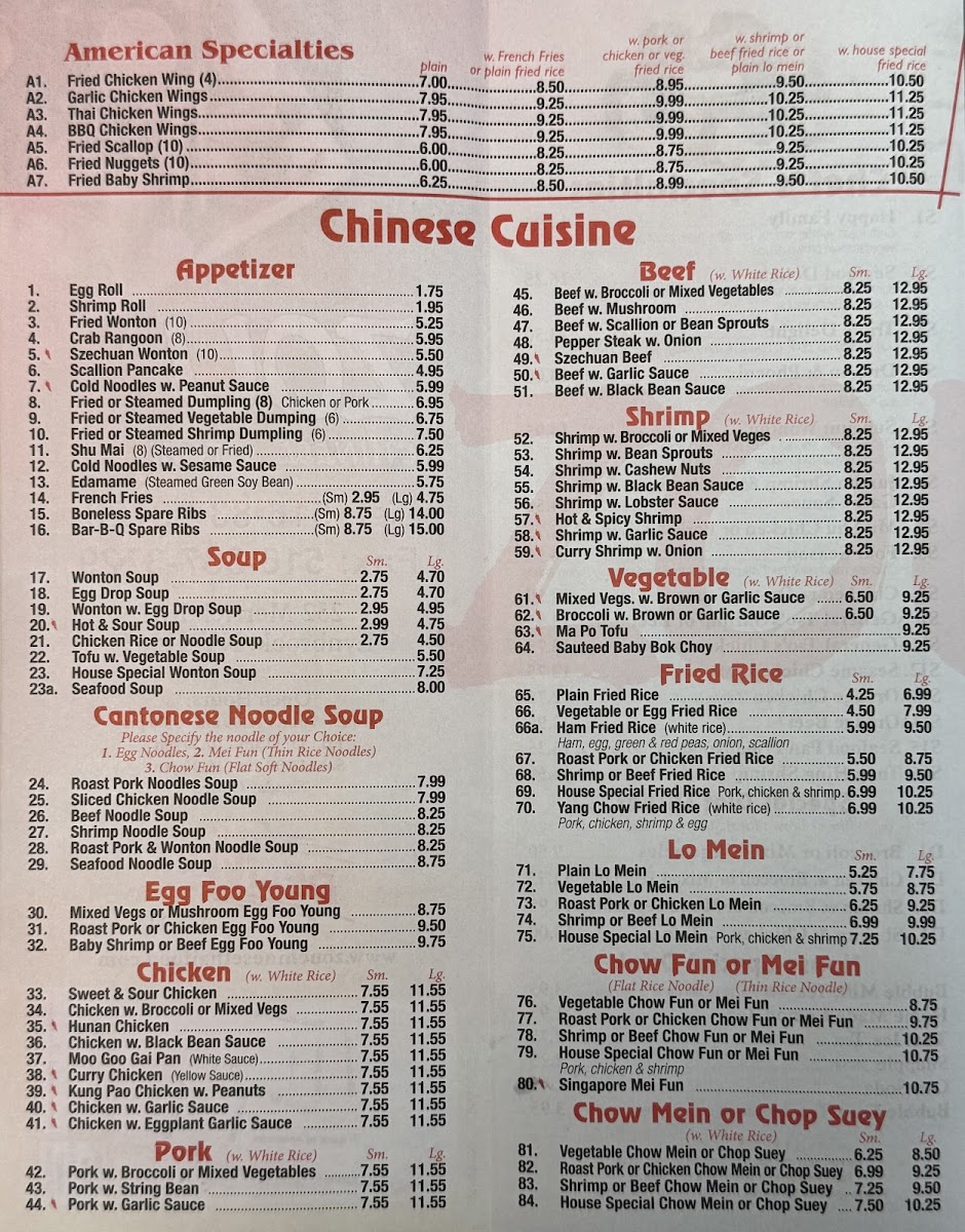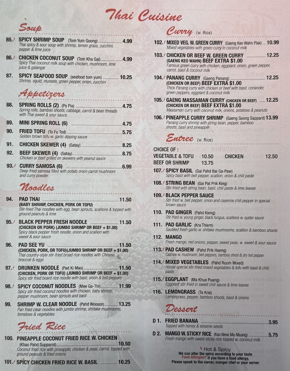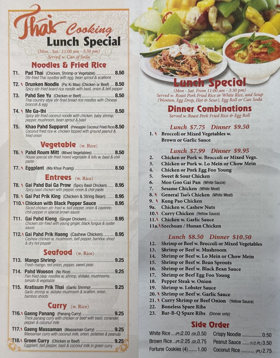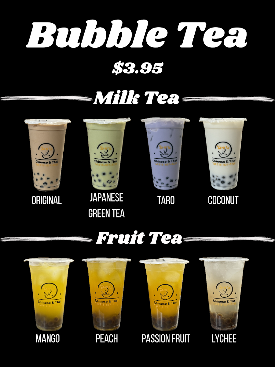 Zou Chinese And Thai Food at 252 Merrick Rd, Lynbrook offers a menu that is both diverse and satisfying, appealing to fans of American, Chinese, and Thai cuisines alike. Starters range from Fried Chicken Wing (4) and Garlic Chicken Wings to Crab Rangoon (8) and Szechuan Wonton (10), giving diners a flavorful introduction to the meal. Soups like SPICY SHRIMP SOUP (Tom Yum Goong) and CHICKEN COCONUT SOUP (Tom Kha Gai) bring authentic Thai warmth and spice, while appetizers such as SPRING ROLLS (2) (Po Pia) and BEEF SKEWER (4) (Satay) provide light yet satisfying bites. Noodle lovers will enjoy PAD THAI, BLACK PEPPER FRESH NOODLE, and PAD SEE YUDRUNKEN NOODLE (Pad Ki Mao), complemented by fried rice options like PINEAPPLE COCONUT FRIED RICE W. CHICKEN (Khao Pahd Supparot) and SPICY CHICKEN FRIED RICE W. BASIL. The curry section impresses with dishes such as MIXED VEG. W. GREEN CURRY (Gaeng Keo Wahn Plak), PANANG CURRY (Gaeng Panang), and PINEAPPLE CURRY SHRIMP (Gaeng Goong Sappard), all rich and aromatic. Entrees like SPICY BASIL (Gai Pahd Bai Ga-Paw), STRING BEAN (Gai Pat Prik King), and PAD GARLIC (Kra Thiem) showcase bold flavors and skillful preparation. Chef’s specialties, including Happy Family and Triple Delight, offer hearty, show-stopping options, while desserts such as FRIED BANANA and MANGO W. STICKY RICE (Kao Niew Ma-Muang) provide a sweet finish. For those mindful of diet, selections like Broccoli or Mixed Vegetables and Shrimp & Chicken w. Tofu cater to lighter preferences. Rounding out the experience are house drinks such as Bubble Milk Tea and Thai Ice Tea, perfect for pairing with any dish. Overall, Zou delivers a menu full of recognizable classics and flavorful Thai and Chinese specialties, all presented in generous portions and reasonably priced.